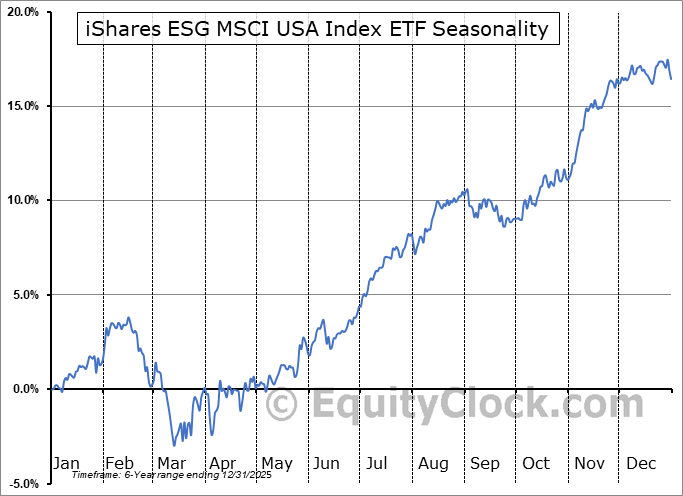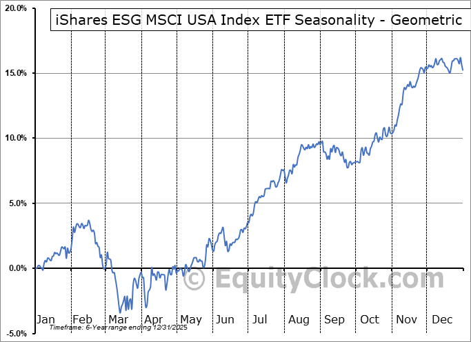 Analysis of the iShares ESG MSCI USA Index ETF (TSE:XSUS.TO) seasonal charts above shows that a Buy Date of June 8 and a Sell Date of October 30 has resulted in a geometric average return of 2.91% above the benchmark rate of the S&P 500 Total Return Index over the past 5 years. This seasonal timeframe has shown positive results compared to the benchmark in 5 of those periods. This is an excellent rate of success and the return outperforms the relative buy-and-hold performance of the stock over the past 5 years by an average of 1.48% per year.
