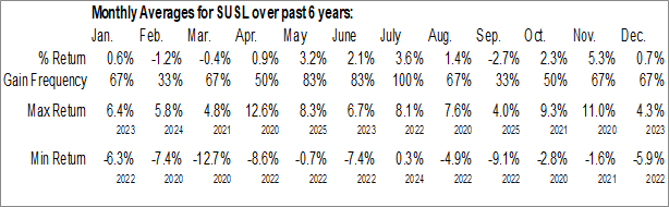 A word of caution: Only 6 years of data is available for shares of SUSL, perhaps insufficient to create a seasonal profile that accurately gauges the seasonal tendencies influencing the investment. Ideally, while 20 years is preferred, at least 10 years of data is required to perform a seasonal analysis that is considered to be reliable for future seasonal periods.