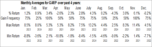 A word of caution: Only 4 years of data is available for shares of GARP, perhaps insufficient to create a seasonal profile that accurately gauges the seasonal tendencies influencing the investment. Ideally, while 20 years is preferred, at least 10 years of data is required to perform a seasonal analysis that is considered to be reliable for future seasonal periods.