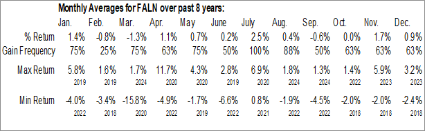 A word of caution: Only 8 years of data is available for shares of FALN, perhaps insufficient to create a seasonal profile that accurately gauges the seasonal tendencies influencing the investment. Ideally, while 20 years is preferred, at least 10 years of data is required to perform a seasonal analysis that is considered to be reliable for future seasonal periods.