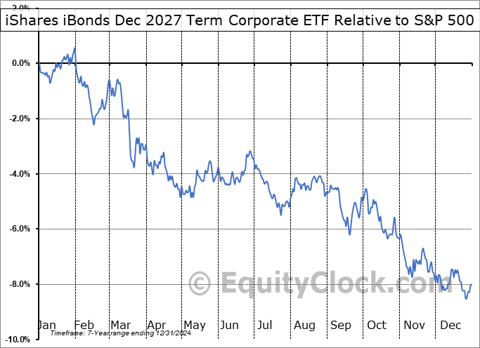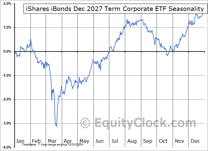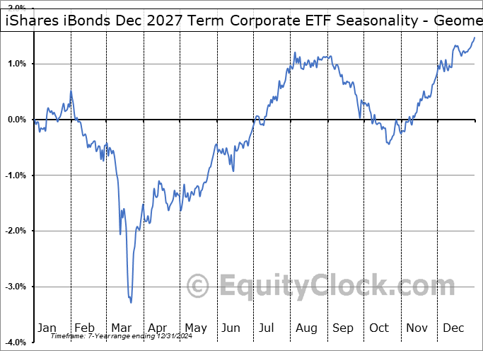 Analysis of the iShares iBonds Dec 2027 Term Corporate ETF (AMEX:IBDS) seasonal charts above shows that a Buy Date of July 10 and a Sell Date of October 3 has resulted in a geometric average return of 0.16% above the benchmark rate of the S&P 500 Total Return Index over the past 7 years. This seasonal timeframe has shown positive results compared to the benchmark in 5 of those periods. This is a good rate of success and the return strongly outperforms the relative buy-and-hold performance of the stock over the past 7 years by an average of 10.73% per year.