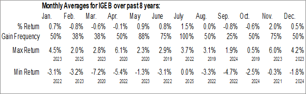 A word of caution: Only 7 years of data is available for shares of IGEB, perhaps insufficient to create a seasonal profile that accurately gauges the seasonal tendencies influencing the investment. Ideally, while 20 years is preferred, at least 10 years of data is required to perform a seasonal analysis that is considered to be reliable for future seasonal periods.