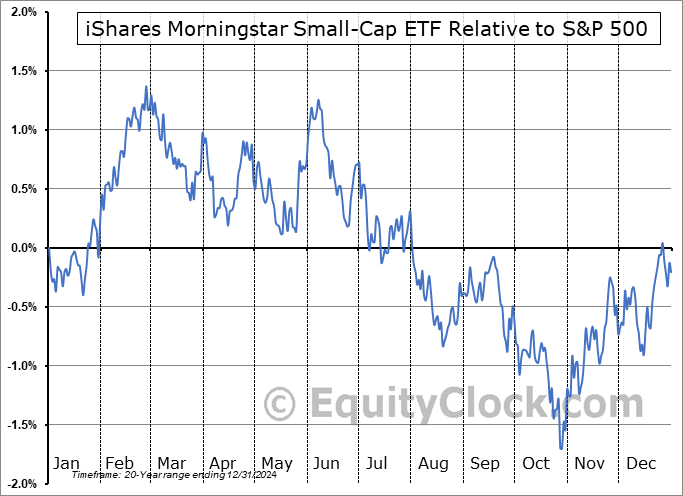 Analysis of the iShares Morningstar Small-Cap ETF (NYSE:ISCB) seasonal charts above shows that a Buy Date of October 28 and a Sell Date of February 27 has resulted in a geometric average return of 2.27% above the benchmark rate of the S&P 500 Total Return Index over the past 20 years. This seasonal timeframe has shown positive results compared to the benchmark in 16 of those periods. This is a very good rate of success and the return strongly outperforms the relative buy-and-hold performance of the stock over the past 20 years by an average of 4.47% per year.