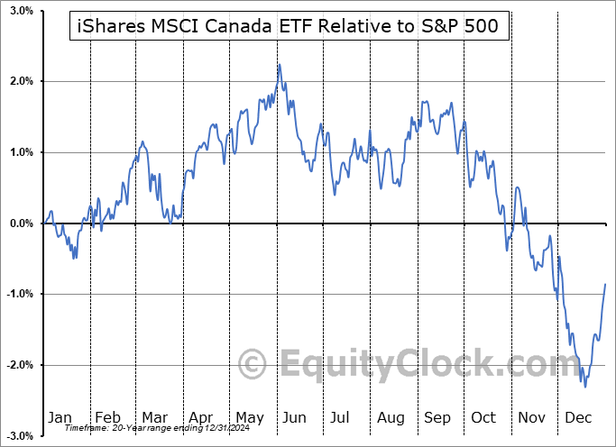 Analysis of the iShares MSCI Canada ETF (NYSE:EWC) seasonal charts above shows that a Buy Date of December 18 and a Sell Date of April 18 has resulted in a geometric average return of 2.05% above the benchmark rate of the S&P 500 Total Return Index over the past 20 years. This seasonal timeframe has shown positive results compared to the benchmark in 14 of those periods. This is a good rate of success and the return strongly outperforms the relative buy-and-hold performance of the stock over the past 20 years by an average of 5.39% per year.
