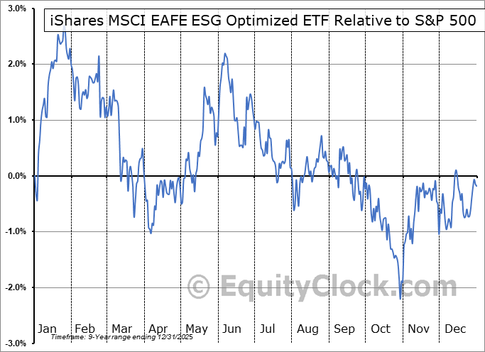 Analysis of the iShares MSCI EAFE ESG Optimized ETF (NASD:ESGD) seasonal charts above shows that a Buy Date of March 13 and a Sell Date of June 2 has resulted in a geometric average return of 0.72% above the benchmark rate of the S&P 500 Total Return Index over the past 8 years. This seasonal timeframe has shown positive results compared to the benchmark in 6 of those periods. This is a good rate of success and the return strongly outperforms the relative buy-and-hold performance of the stock over the past 8 years by an average of 7.57% per year.