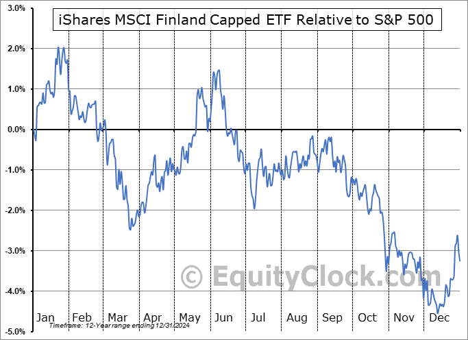 Analysis of the iShares MSCI Finland Capped ETF (AMEX:EFNL) seasonal charts above shows that a Buy Date of November 14 and a Sell Date of February 6 has resulted in a geometric average return of 0.99% above the benchmark rate of the S&P 500 Total Return Index over the past 12 years. This seasonal timeframe has shown positive results compared to the benchmark in 10 of those periods. This is a very good rate of success and the return strongly outperforms the relative buy-and-hold performance of the stock over the past 12 years by an average of 8.92% per year.