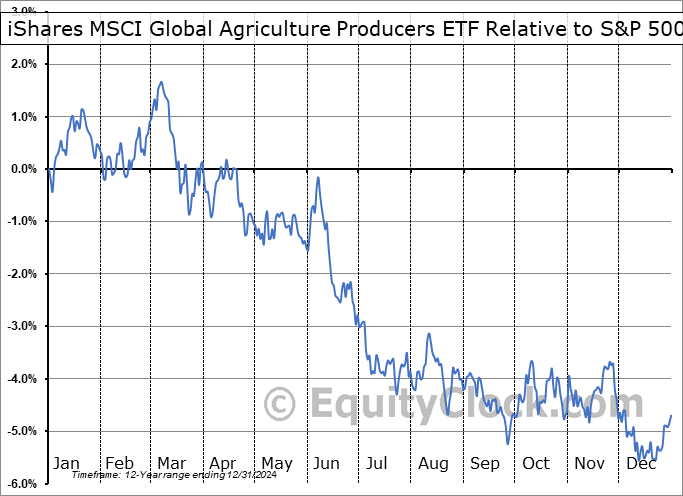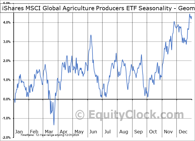 Analysis of the iShares MSCI Global Agriculture Producers ETF (AMEX:VEGI) seasonal charts above shows that a Buy Date of August 22 and a Sell Date of January 7 has resulted in a geometric average return of 0.23% above the benchmark rate of the S&P 500 Total Return Index over the past 12 years. This seasonal timeframe has shown positive results compared to the benchmark in 7 of those periods. This is a fair rate of success and the return strongly outperforms the relative buy-and-hold performance of the stock over the past 12 years by an average of 9.07% per year.