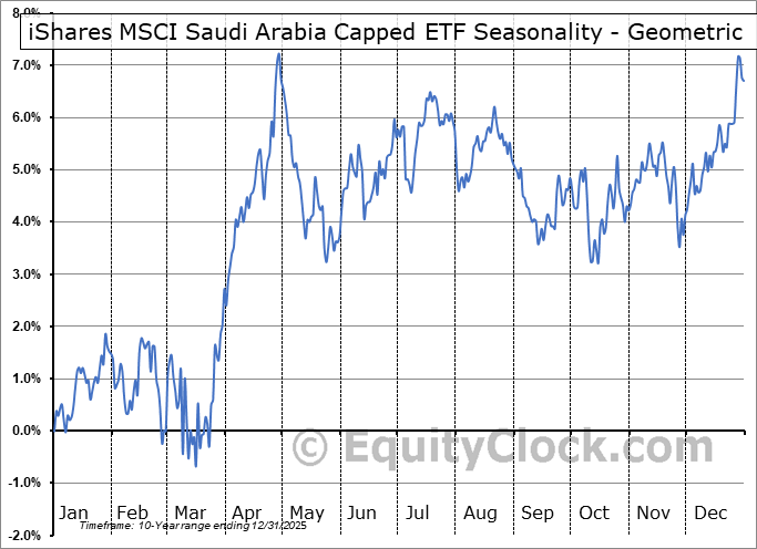 Analysis of the iShares MSCI Saudi Arabia Capped ETF (AMEX:KSA) seasonal charts above shows that a Buy Date of February 4 and a Sell Date of April 30 has resulted in a geometric average return of 5.7% above the benchmark rate of the S&P 500 Total Return Index over the past 10 years. This seasonal timeframe has shown positive results compared to the benchmark in 8 of those periods. This is a very good rate of success and the return strongly outperforms the relative buy-and-hold performance of the stock over the past 10 years by an average of 12.54% per year.
