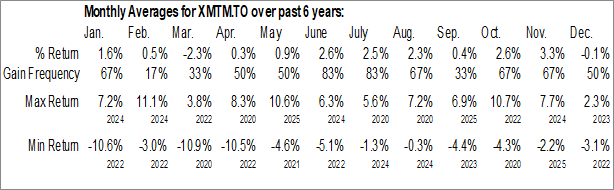 To download XMTM.TO seasonal chart data, please log in or Subscribe.