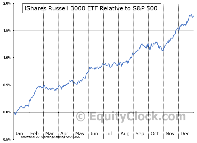 Analysis of the iShares Russell 3000 ETF (NYSE:IWV) seasonal charts above shows that a Buy Date of November 7 and a Sell Date of February 24 has resulted in a geometric average return of 0.35% above the benchmark rate of the S&P 500 Total Return Index over the past 20 years. This seasonal timeframe has shown positive results compared to the benchmark in 17 of those periods. This is a very good rate of success and the return slightly outperforms the relative buy-and-hold performance of the stock over the past 20 years by an average of 0.52% per year.
