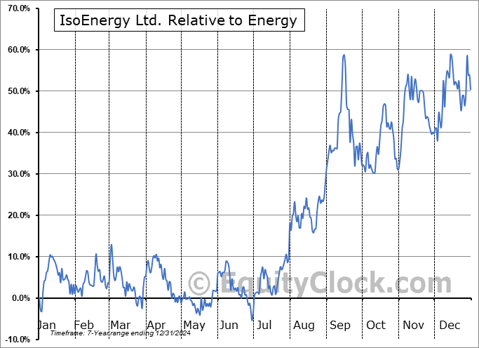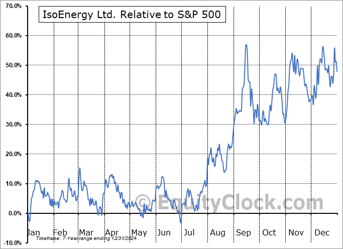 Analysis of the IsoEnergy Ltd. (AMEX:ISOU) seasonal charts above shows that a Buy Date of June 29 and a Sell Date of September 21 has resulted in a geometric average return of 30.47% above the benchmark rate of the S&P 500 Total Return Index over the past 7 years. This seasonal timeframe has shown positive results compared to the benchmark in 6 of those periods. This is a very good rate of success and the return strongly outperforms the relative buy-and-hold performance of the stock over the past 7 years by an average of 21.55% per year.