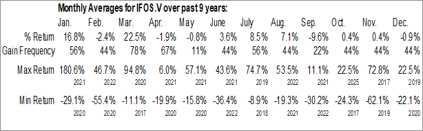 A word of caution: Only 8 years of data is available for shares of IFOS.V, perhaps insufficient to create a seasonal profile that accurately gauges the seasonal tendencies influencing the investment. Ideally, while 20 years is preferred, at least 10 years of data is required to perform a seasonal analysis that is considered to be reliable for future seasonal periods.