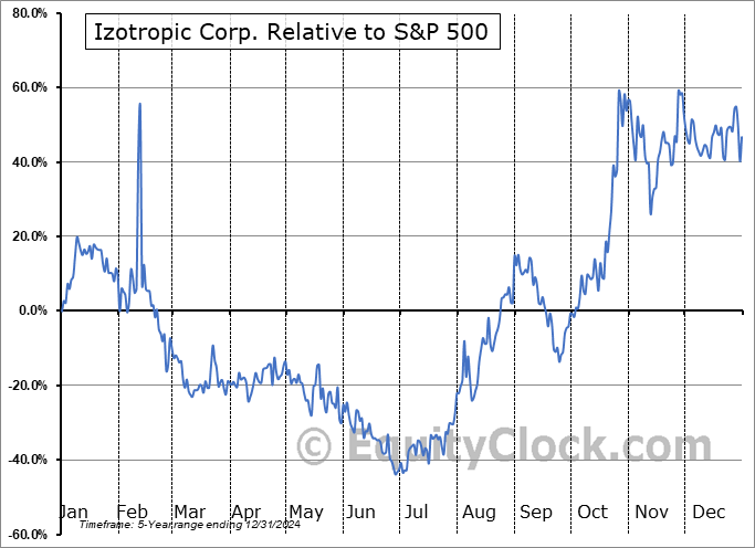 Analysis of the Izotropic Corp. (OTCMKT:IZOZF) seasonal charts above shows that a Buy Date of July 16 and a Sell Date of October 21 has resulted in a geometric average return of 39.63% above the benchmark rate of the S&P 500 Total Return Index over the past 5 years. This seasonal timeframe has shown positive results compared to the benchmark in 5 of those periods. This is an excellent rate of success and the return strongly outperforms the relative buy-and-hold performance of the stock over the past 5 years by an average of 76.32% per year.