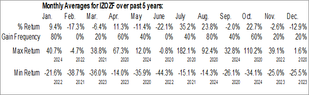 A word of caution: Only 5 years of data is available for shares of IZOZF, perhaps insufficient to create a seasonal profile that accurately gauges the seasonal tendencies influencing the investment. Ideally, while 20 years is preferred, at least 10 years of data is required to perform a seasonal analysis that is considered to be reliable for future seasonal periods.
