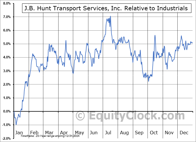 Analysis of the J.B. Hunt Transport Services, Inc. (NASD:JBHT) seasonal charts above shows that a Buy Date of November 9 and a Sell Date of February 6 has resulted in a geometric average return of 5.02% above the benchmark rate of the S&P 500 Total Return Index over the past 20 years. This seasonal timeframe has shown positive results compared to the benchmark in 18 of those periods. This is an excellent rate of success and the return strongly outperforms the relative buy-and-hold performance of the stock over the past 20 years by an average of 3.4% per year.