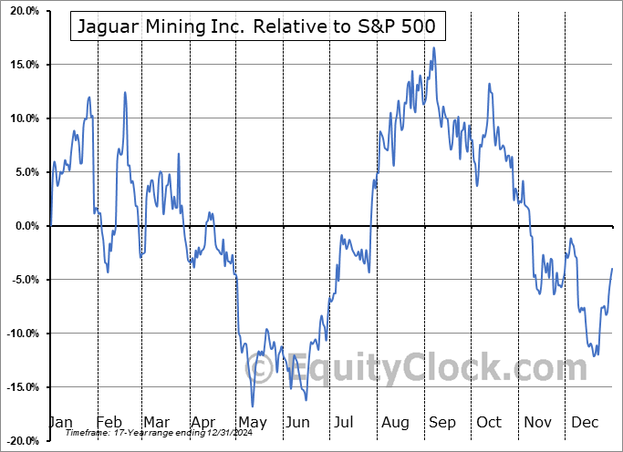 Analysis of the Jaguar Mining Inc. (OTCMKT:JAGGF) seasonal charts above shows that a Buy Date of November 14 and a Sell Date of February 18 has resulted in a geometric average return of 11.96% above the benchmark rate of the S&P 500 Total Return Index over the past 17 years. This seasonal timeframe has shown positive results compared to the benchmark in 11 of those periods. This is a fair rate of success and the return strongly outperforms the relative buy-and-hold performance of the stock over the past 17 years by an average of 111.96% per year.