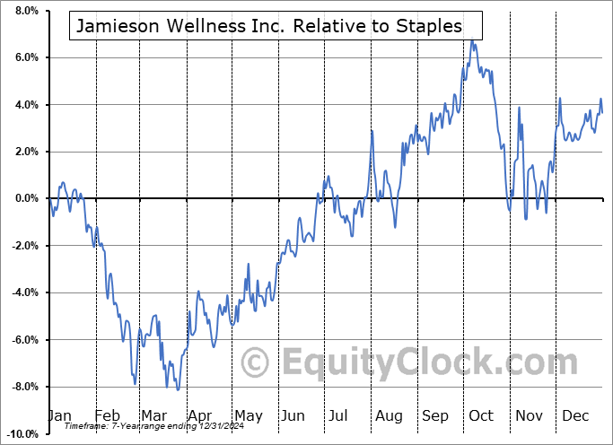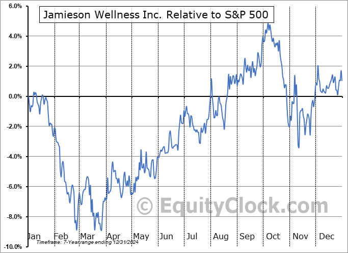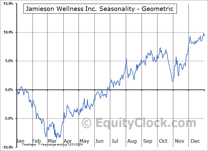 Analysis of the Jamieson Wellness Inc. (TSE:JWEL.TO) seasonal charts above shows that a Buy Date of July 18 and a Sell Date of October 6 has resulted in a geometric average return of 5.91% above the benchmark rate of the S&P 500 Total Return Index over the past 7 years. This seasonal timeframe has shown positive results compared to the benchmark in 6 of those periods. This is a very good rate of success and the return strongly outperforms the relative buy-and-hold performance of the stock over the past 7 years by an average of 9.55% per year.