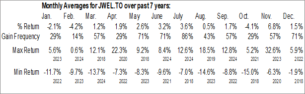 A word of caution: Only 7 years of data is available for shares of JWEL.TO, perhaps insufficient to create a seasonal profile that accurately gauges the seasonal tendencies influencing the investment. Ideally, while 20 years is preferred, at least 10 years of data is required to perform a seasonal analysis that is considered to be reliable for future seasonal periods.
