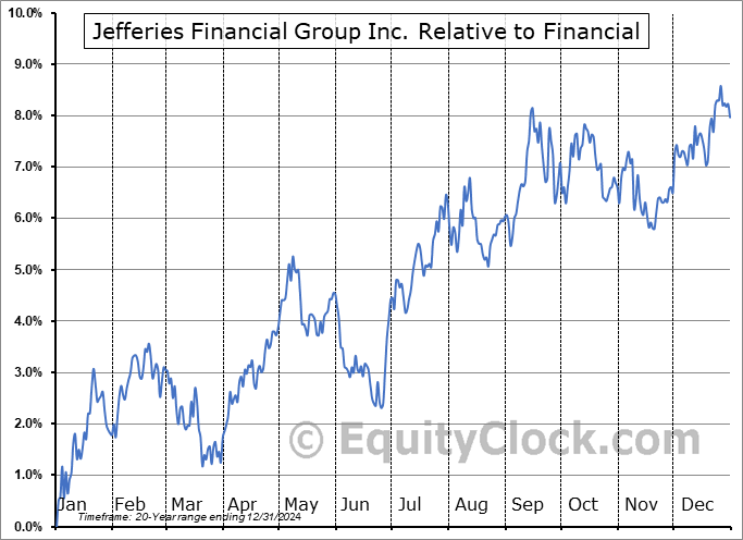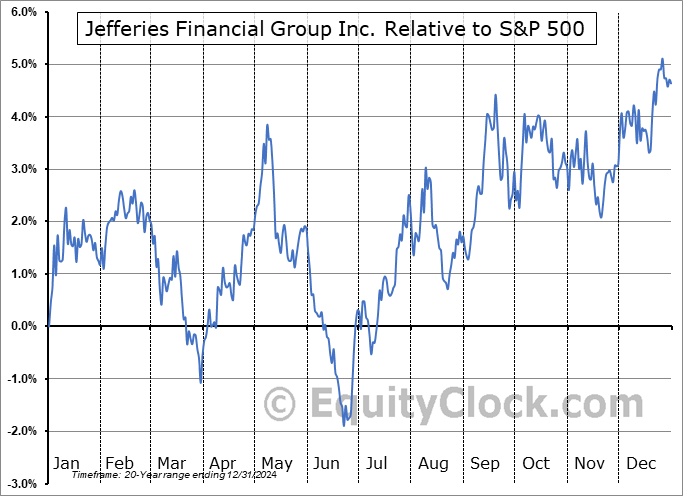Analysis of the Jefferies Financial Group Inc. (NYSE:JEF) seasonal charts above shows that a Buy Date of December 9 and a Sell Date of February 27 has resulted in a geometric average return of 1.42% above the benchmark rate of the S&P 500 Total Return Index over the past 20 years. This seasonal timeframe has shown positive results compared to the benchmark in 15 of those periods. This is a good rate of success and the return strongly outperforms the relative buy-and-hold performance of the stock over the past 20 years by an average of 2.75% per year.
