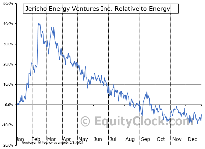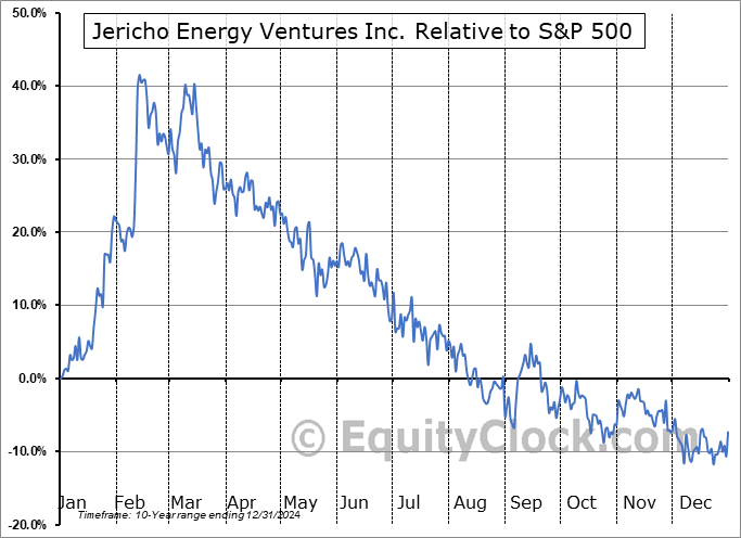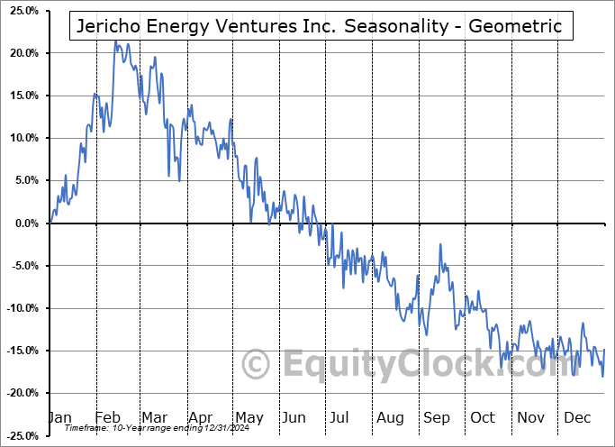 Analysis of the Jericho Energy Ventures Inc. (OTCMKT:JROOF) seasonal charts above shows that a Buy Date of November 20 and a Sell Date of March 1 has resulted in a geometric average return of 20.1% above the benchmark rate of the S&P 500 Total Return Index over the past 10 years. This seasonal timeframe has shown positive results compared to the benchmark in 7 of those periods. This is a good rate of success and the return strongly outperforms the relative buy-and-hold performance of the stock over the past 10 years by an average of 44.7% per year.