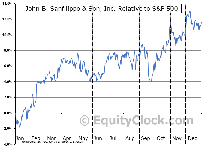 Analysis of the John B. Sanfilippo & Son, Inc. (NASD:JBSS) seasonal charts above shows that a Buy Date of November 29 and a Sell Date of March 31 has resulted in a geometric average return of 6.95% above the benchmark rate of the S&P 500 Total Return Index over the past 20 years. This seasonal timeframe has shown positive results compared to the benchmark in 16 of those periods. This is a very good rate of success and the return strongly outperforms the relative buy-and-hold performance of the stock over the past 20 years by an average of 7.84% per year.