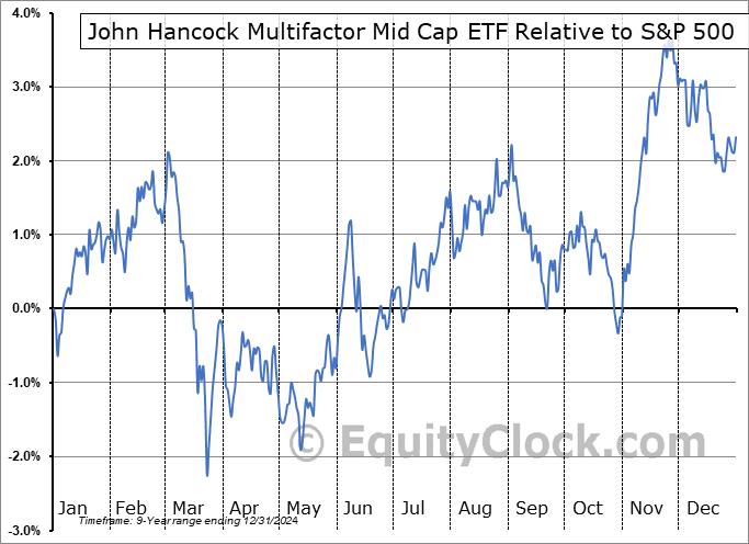 Analysis of the John Hancock Multifactor Mid Cap ETF (AMEX:JHMM) seasonal charts above shows that a Buy Date of December 10 and a Sell Date of March 7 has resulted in a geometric average return of 0.21% above the benchmark rate of the S&P 500 Total Return Index over the past 9 years. This seasonal timeframe has shown positive results compared to the benchmark in 7 of those periods. This is a good rate of success and the return strongly outperforms the relative buy-and-hold performance of the stock over the past 9 years by an average of 2.98% per year.