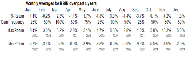A word of caution: Only 4 years of data is available for shares of BBIN, perhaps insufficient to create a seasonal profile that accurately gauges the seasonal tendencies influencing the investment. Ideally, while 20 years is preferred, at least 10 years of data is required to perform a seasonal analysis that is considered to be reliable for future seasonal periods.