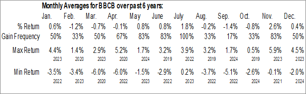 A word of caution: Only 6 years of data is available for shares of BBCB, perhaps insufficient to create a seasonal profile that accurately gauges the seasonal tendencies influencing the investment. Ideally, while 20 years is preferred, at least 10 years of data is required to perform a seasonal analysis that is considered to be reliable for future seasonal periods.