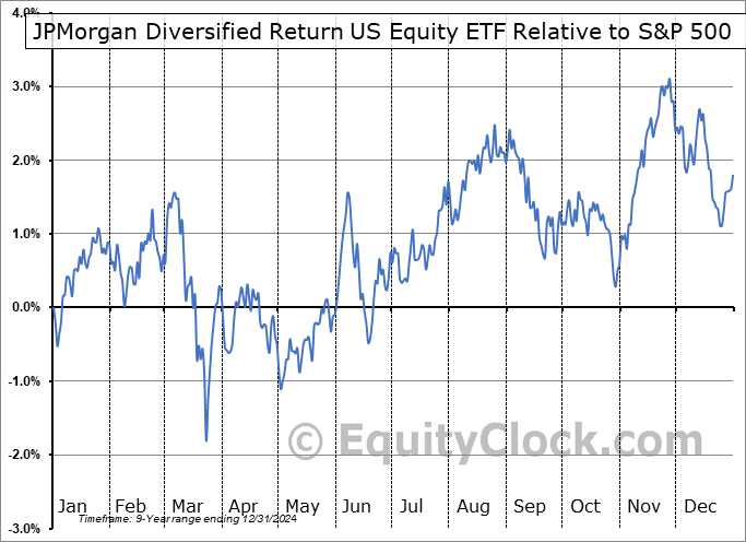 Analysis of the JPMorgan Diversified Return US Equity ETF (AMEX:JPUS) seasonal charts above shows that a Buy Date of October 3 and a Sell Date of January 7 has resulted in a geometric average return of 0.5% above the benchmark rate of the S&P 500 Total Return Index over the past 9 years. This seasonal timeframe has shown positive results compared to the benchmark in 6 of those periods. This is a good rate of success and the return strongly outperforms the relative buy-and-hold performance of the stock over the past 9 years by an average of 3.43% per year.