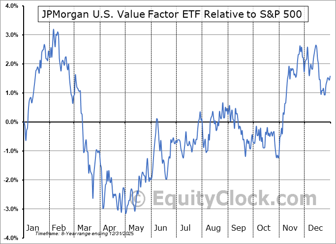Analysis of the JPMorgan U.S. Value Factor ETF (AMEX:JVAL) seasonal charts above shows that a Buy Date of September 1 and a Sell Date of January 7 has resulted in a geometric average return of 3.54% above the benchmark rate of the S&P 500 Total Return Index over the past 6 years. This seasonal timeframe has shown positive results compared to the benchmark in 6 of those periods. This is an excellent rate of success and the return strongly outperforms the relative buy-and-hold performance of the stock over the past 6 years by an average of 6.9% per year.