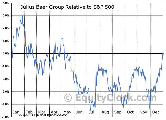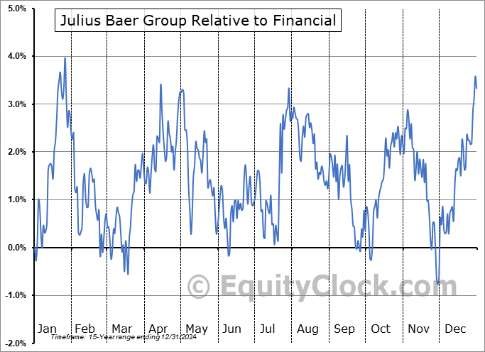 Analysis of the Julius Baer Group (OTCMKT:JBAXY) seasonal charts above shows that a Buy Date of July 9 and a Sell Date of October 27 has resulted in a geometric average return of 1.76% above the benchmark rate of the S&P 500 Total Return Index over the past 14 years. This seasonal timeframe has shown positive results compared to the benchmark in 12 of those periods. This is a very good rate of success and the return strongly outperforms the relative buy-and-hold performance of the stock over the past 14 years by an average of 8.44% per year.