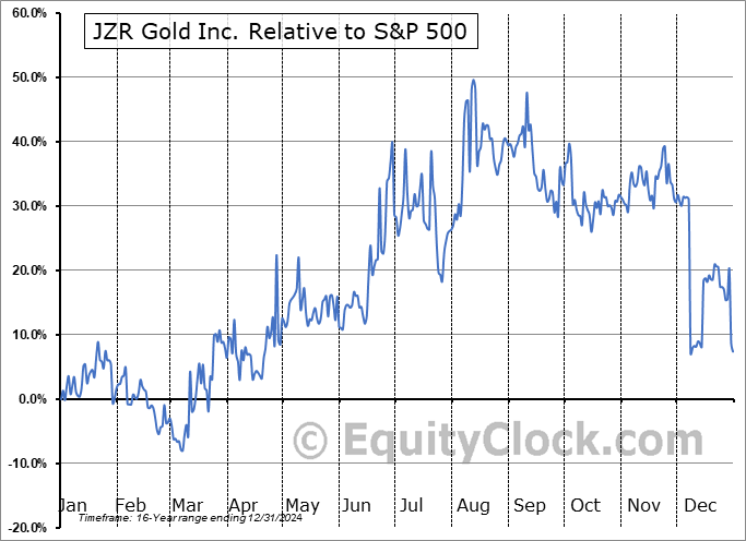 Analysis of the JZR Gold Inc. (TSXV:JZR.V) seasonal charts above shows that a Buy Date of June 2 and a Sell Date of September 6 has resulted in a geometric average return of 12.82% above the benchmark rate of the S&P 500 Total Return Index over the past 16 years. This seasonal timeframe has shown positive results compared to the benchmark in 12 of those periods. This is a good rate of success and the return strongly outperforms the relative buy-and-hold performance of the stock over the past 16 years by an average of 34.54% per year.