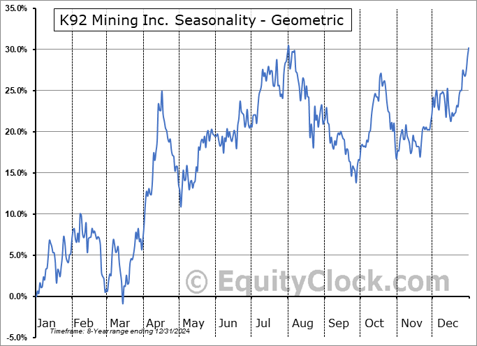 Analysis of the K92 Mining Inc. (OTCMKT:KNTNF) seasonal charts above shows that a Buy Date of September 27 and a Sell Date of January 1 has resulted in a geometric average return of 8.52% above the benchmark rate of the S&P 500 Total Return Index over the past 8 years. This seasonal timeframe has shown positive results compared to the benchmark in 8 of those periods. This is an excellent rate of success, but the return underperforms the relative buy-and-hold performance of the stock over the past 8 years by an average of 5.43% per year.