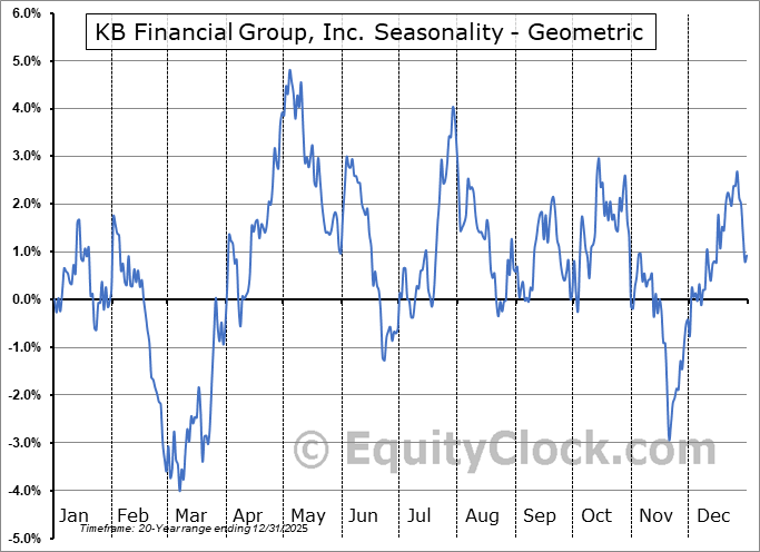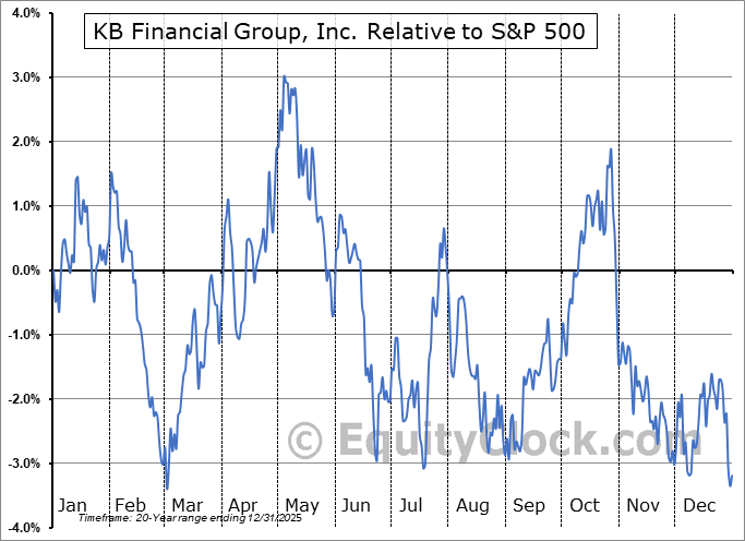 Analysis of the KB Financial Group, Inc. (NYSE:KB) seasonal charts above shows that a Buy Date of July 17 and a Sell Date of October 15 has resulted in a geometric average return of 2.93% above the benchmark rate of the S&P 500 Total Return Index over the past 20 years. This seasonal timeframe has shown positive results compared to the benchmark in 13 of those periods. This is a good rate of success and the return strongly outperforms the relative buy-and-hold performance of the stock over the past 20 years by an average of 10.31% per year.