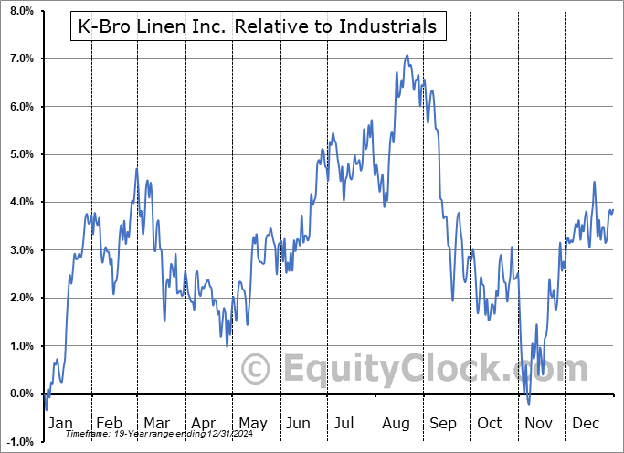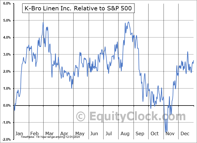 Analysis of the K-Bro Linen Inc. (TSE:KBL.TO) seasonal charts above shows that a Buy Date of November 8 and a Sell Date of February 21 has resulted in a geometric average return of 6.24% above the benchmark rate of the S&P 500 Total Return Index over the past 19 years. This seasonal timeframe has shown positive results compared to the benchmark in 16 of those periods. This is a very good rate of success and the return strongly outperforms the relative buy-and-hold performance of the stock over the past 19 years by an average of 6.75% per year.