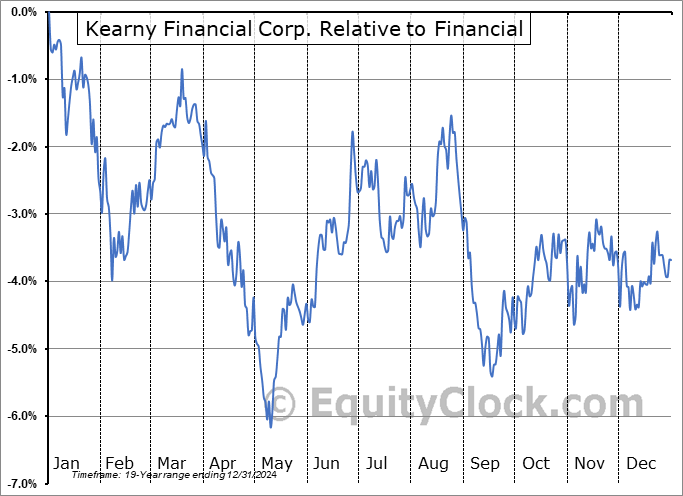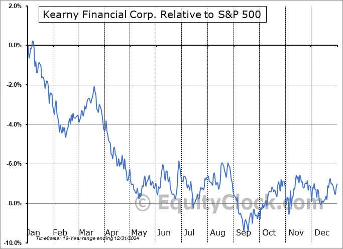 Analysis of the Kearny Financial Corp. (NASD:KRNY) seasonal charts above shows that a Buy Date of September 10 and a Sell Date of December 2 has resulted in a geometric average return of 2.62% above the benchmark rate of the S&P 500 Total Return Index over the past 19 years. This seasonal timeframe has shown positive results compared to the benchmark in 14 of those periods. This is a good rate of success and the return strongly outperforms the relative buy-and-hold performance of the stock over the past 19 years by an average of 11.49% per year.