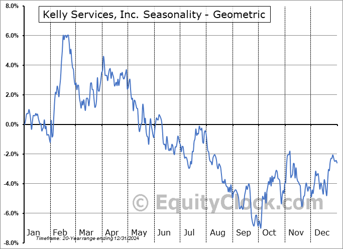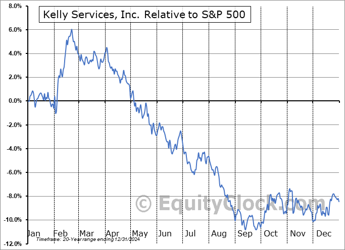 Analysis of the Kelly Services, Inc. (NASD:KELYA) seasonal charts above shows that a Buy Date of September 25 and a Sell Date of February 21 has resulted in a geometric average return of 8.16% above the benchmark rate of the S&P 500 Total Return Index over the past 20 years. This seasonal timeframe has shown positive results compared to the benchmark in 17 of those periods. This is a very good rate of success and the return strongly outperforms the relative buy-and-hold performance of the stock over the past 20 years by an average of 19.81% per year.