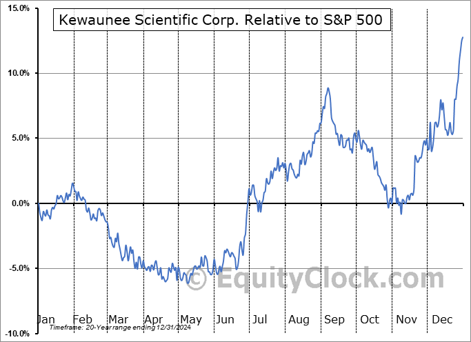 Analysis of the Kewaunee Scientific Corp. (NASD:KEQU) seasonal charts above shows that a Buy Date of April 19 and a Sell Date of September 6 has resulted in a geometric average return of 9.77% above the benchmark rate of the S&P 500 Total Return Index over the past 20 years. This seasonal timeframe has shown positive results compared to the benchmark in 15 of those periods. This is a good rate of success and the return strongly outperforms the relative buy-and-hold performance of the stock over the past 20 years by an average of 7.78% per year.