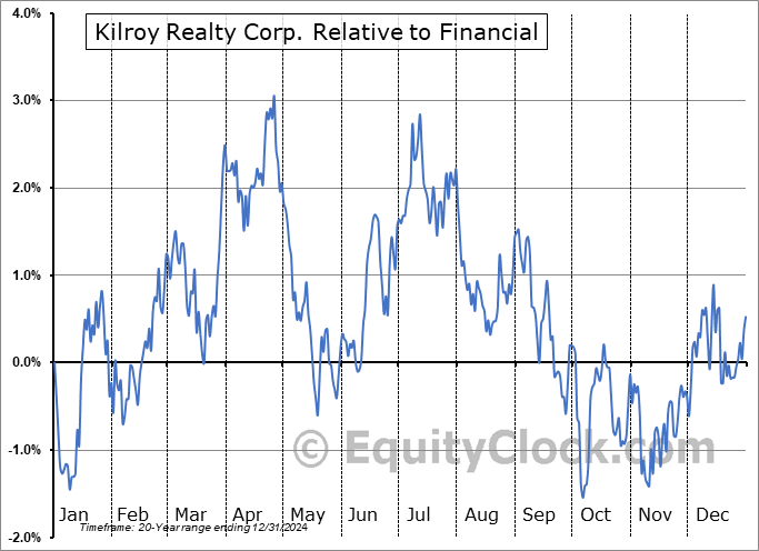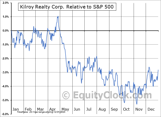 Analysis of the Kilroy Realty Corp. (NYSE:KRC) seasonal charts above shows that a Buy Date of November 8 and a Sell Date of March 1 has resulted in a geometric average return of 1.4% above the benchmark rate of the S&P 500 Total Return Index over the past 20 years. This seasonal timeframe has shown positive results compared to the benchmark in 14 of those periods. This is a good rate of success and the return strongly outperforms the relative buy-and-hold performance of the stock over the past 20 years by an average of 7.21% per year.