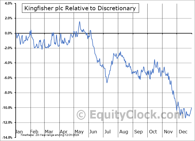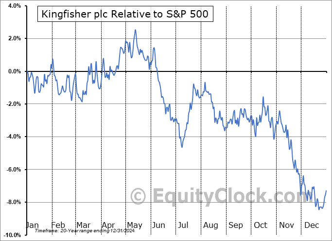 Analysis of the Kingfisher plc (OTCMKT:KGFHY) seasonal charts above shows that a Buy Date of February 16 and a Sell Date of May 12 has resulted in a geometric average return of 2.17% above the benchmark rate of the S&P 500 Total Return Index over the past 20 years. This seasonal timeframe has shown positive results compared to the benchmark in 14 of those periods. This is a good rate of success and the return strongly outperforms the relative buy-and-hold performance of the stock over the past 20 years by an average of 13.5% per year.