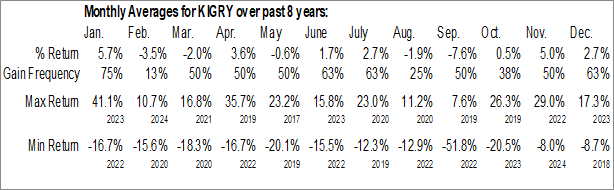 A word of caution: Only 8 years of data is available for shares of KIGRY, perhaps insufficient to create a seasonal profile that accurately gauges the seasonal tendencies influencing the investment. Ideally, while 20 years is preferred, at least 10 years of data is required to perform a seasonal analysis that is considered to be reliable for future seasonal periods.