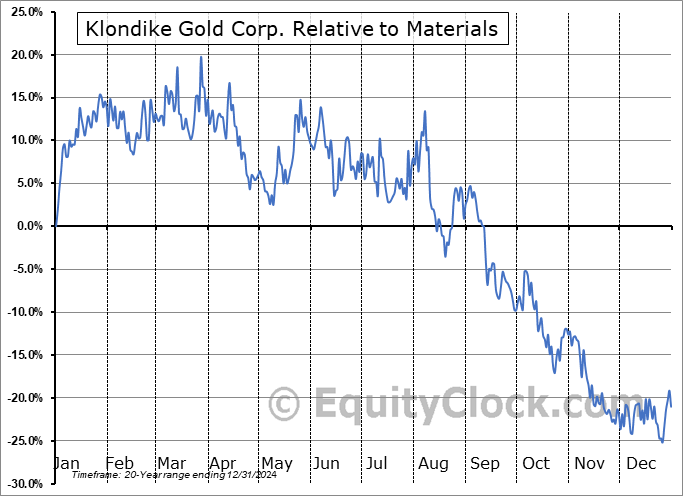 Analysis of the Klondike Gold Corp. (TSXV:KG.V) seasonal charts above shows that a Buy Date of December 24 and a Sell Date of March 13 has resulted in a geometric average return of 18.04% above the benchmark rate of the S&P 500 Total Return Index over the past 20 years. This seasonal timeframe has shown positive results compared to the benchmark in 15 of those periods. This is a good rate of success and the return strongly outperforms the relative buy-and-hold performance of the stock over the past 20 years by an average of 49.66% per year.