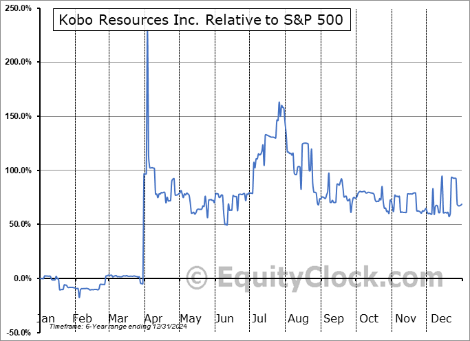 Analysis of the Kobo Resources Inc. (TSXV:KRI.V) seasonal charts above shows that a Buy Date of February 4 and a Sell Date of May 21 has resulted in a geometric average return of 72.9% above the benchmark rate of the S&P 500 Total Return Index over the past 6 years. This seasonal timeframe has shown positive results compared to the benchmark in 5 of those periods. This is a very good rate of success and the return strongly outperforms the relative buy-and-hold performance of the stock over the past 6 years by an average of 75.26% per year.