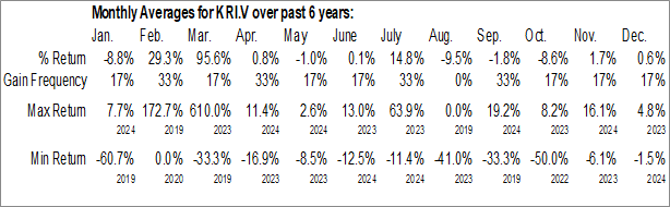 A word of caution: Only 6 years of data is available for shares of KRI.V, perhaps insufficient to create a seasonal profile that accurately gauges the seasonal tendencies influencing the investment. Ideally, while 20 years is preferred, at least 10 years of data is required to perform a seasonal analysis that is considered to be reliable for future seasonal periods.