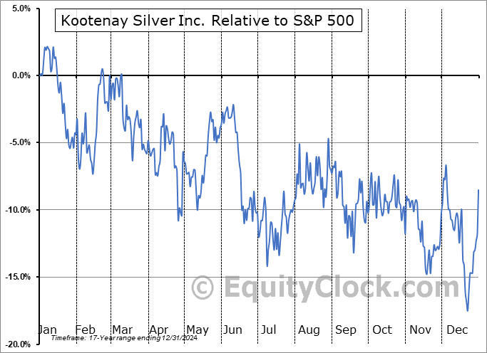 Analysis of the Kootenay Silver Inc. (OTCMKT:KOOYF) seasonal charts above shows that a Buy Date of November 18 and a Sell Date of February 21 has resulted in a geometric average return of 1.85% above the benchmark rate of the S&P 500 Total Return Index over the past 16 years. This seasonal timeframe has shown positive results compared to the benchmark in 12 of those periods. This is a good rate of success and the return strongly outperforms the relative buy-and-hold performance of the stock over the past 16 years by an average of 28.71% per year.