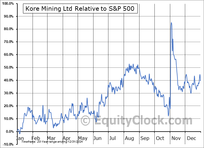 Analysis of the Kore Mining Ltd (TSXV:KORE.V) seasonal charts above shows that a Buy Date of November 25 and a Sell Date of February 21 has resulted in a geometric average return of 21.75% above the benchmark rate of the S&P 500 Total Return Index over the past 20 years. This seasonal timeframe has shown positive results compared to the benchmark in 14 of those periods. This is a good rate of success and the return strongly outperforms the relative buy-and-hold performance of the stock over the past 20 years by an average of 38.92% per year.