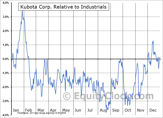 Analysis of the Kubota Corp. (OTCMKT:KUBTY) seasonal charts above shows that a Buy Date of September 6 and a Sell Date of January 25 has resulted in a geometric average return of 4.48% above the benchmark rate of the S&P 500 Total Return Index over the past 20 years. This seasonal timeframe has shown positive results compared to the benchmark in 16 of those periods. This is a very good rate of success and the return strongly outperforms the relative buy-and-hold performance of the stock over the past 20 years by an average of 9.52% per year.