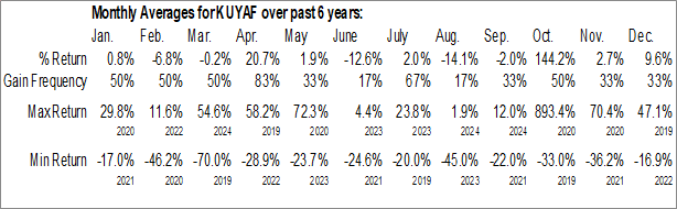 A word of caution: Only 6 years of data is available for shares of KUYAF, perhaps insufficient to create a seasonal profile that accurately gauges the seasonal tendencies influencing the investment. Ideally, while 20 years is preferred, at least 10 years of data is required to perform a seasonal analysis that is considered to be reliable for future seasonal periods.