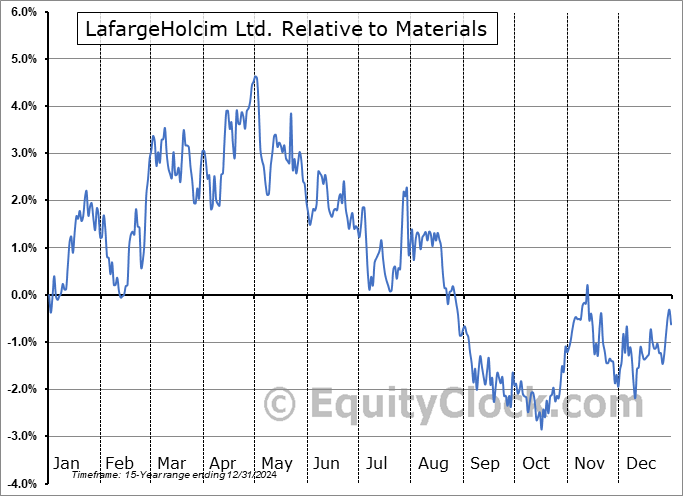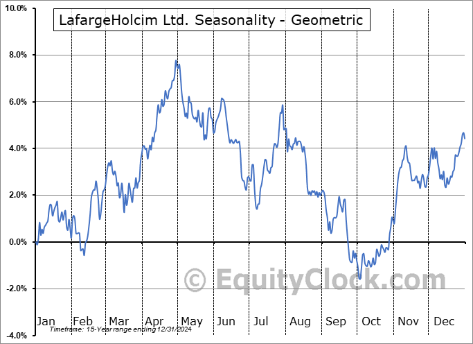 Analysis of the LafargeHolcim Ltd. (OTCMKT:HCMLY) seasonal charts above shows that a Buy Date of December 18 and a Sell Date of April 30 has resulted in a geometric average return of 4.11% above the benchmark rate of the S&P 500 Total Return Index over the past 15 years. This seasonal timeframe has shown positive results compared to the benchmark in 13 of those periods. This is a very good rate of success and the return strongly outperforms the relative buy-and-hold performance of the stock over the past 15 years by an average of 12.24% per year.