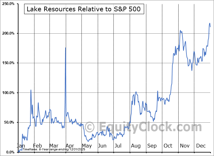 Analysis of the Lake Resources (OTCMKT:LLKKF) seasonal charts above shows that a Buy Date of July 24 and a Sell Date of October 15 has resulted in a geometric average return of 28.48% above the benchmark rate of the S&P 500 Total Return Index over the past 5 years. This seasonal timeframe has shown positive results compared to the benchmark in 5 of those periods. This is an excellent rate of success and the return strongly outperforms the relative buy-and-hold performance of the stock over the past 5 years by an average of 64.23% per year.